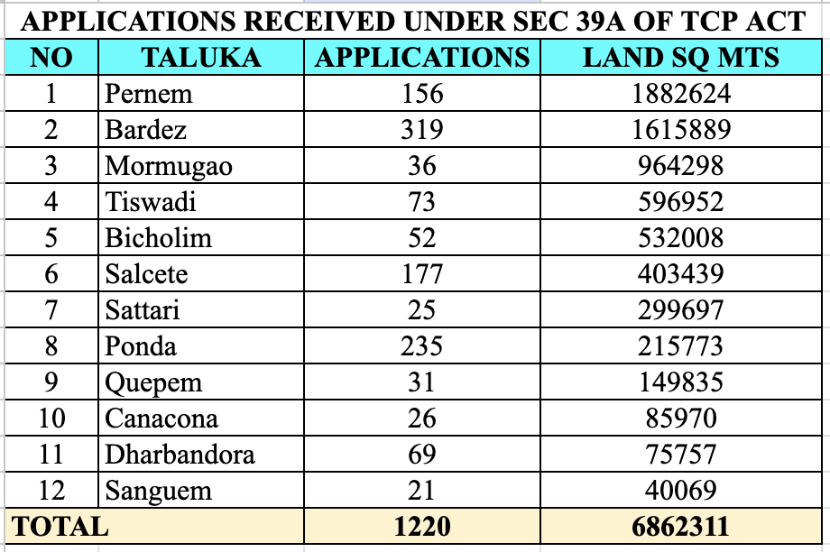 Compared to other talukas, Ponda taluka has received the second-highest number of applications: 235. But the area of land is around 2.16 lakh square metres.