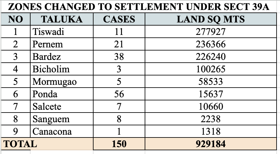Ponda has the largest number of 56 cases where the zone is changed, but, comparatively, the land area is only 2 per cent: 15,637 square metres.