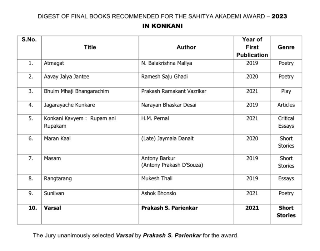 केंद्रीय साहित्य अकादमीन उजावाडायिल्ले प्रसिद्धी पत्रकाप्रमाणें तीन वांगड्यांच्या ज्युरींनी निमणे वळेरेंतल्या 10 पुस्तकांतल्यान ह्या वर्साच्या साहित्य अकादमी पुरस्काराखातीर डॉ प्रकाश पर्येकाराचो ‘वर्सल’ हो कथासंग्रह वेंचून काडलो.