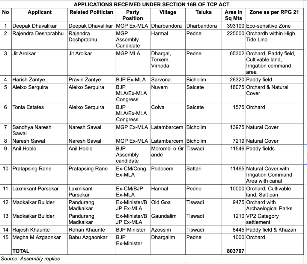 Over 9,000 applications were received under Section 16B, involving approximately two crore square metres of land across Goa. Among the applicants were twelve active politicians from various political parties, both in the ruling and opposition camps. Their collective action to convert green land into settlement areas was striking.
