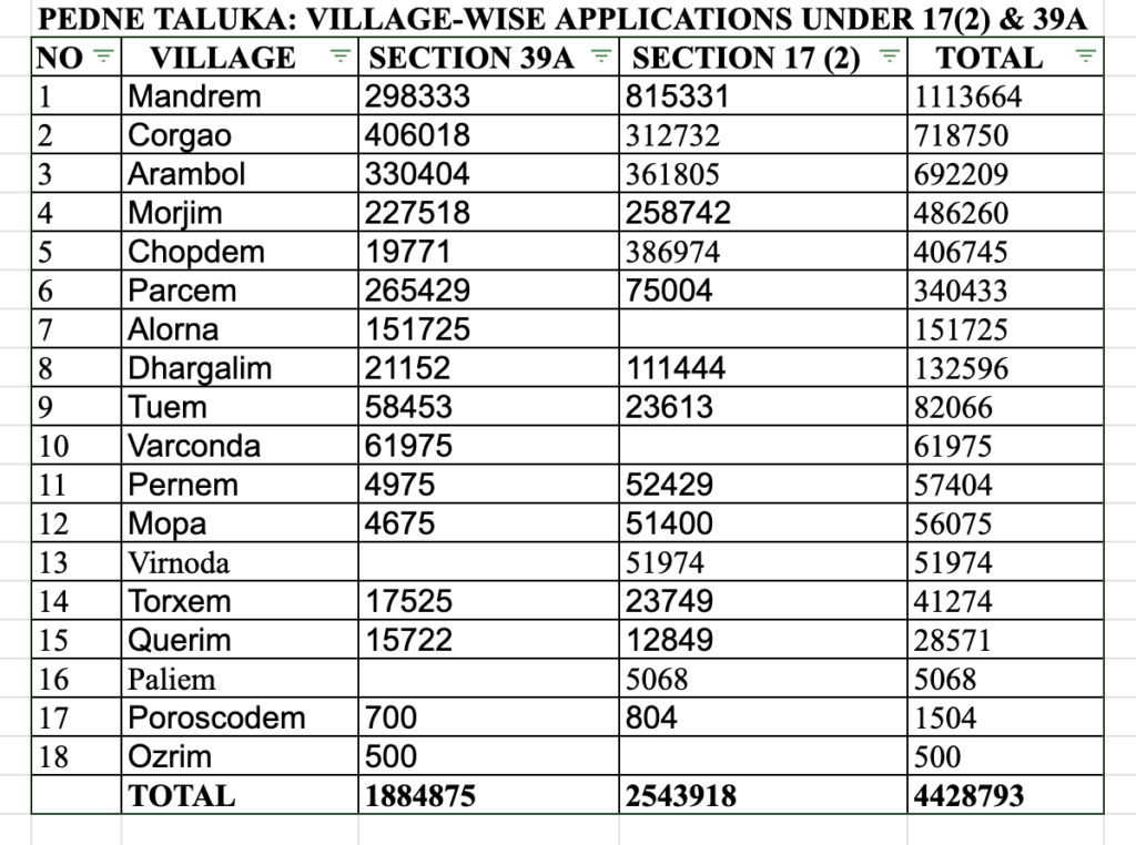 Mandrem village accounts for one-fourth of the total proposed land conversions, with over 11 lakh square metres. Of this, just over 8.15 lakh square metres fall under Section 17(2), and nearly three lakh square metres under Section 39A.