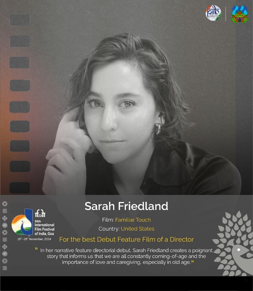 American Director Sarah Friedland was awarded the Best Debut Feature Film award for her poignant narrative Familiar Touch. This award highlights promising new talent in global cinema. Sarah Friedland received a Silver Peacock Trophy, a certificate, and a cash prize of Rs. 10,00,000.