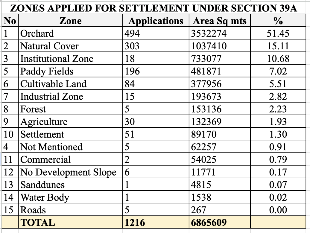 Under 39A, the TCP department has received a total of 303 applications, covering over 10 lakh square metres of Natural Cover. Over 15 per cent of the total number of applications received seek to convert this natural cover into the settlement zone.