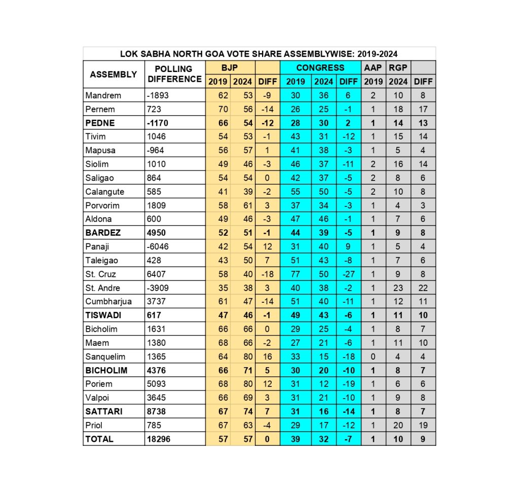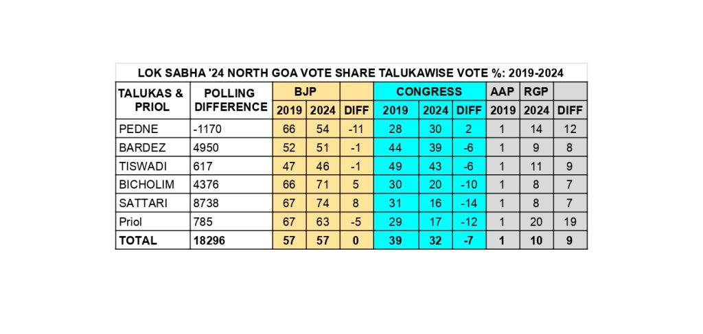 Also, in Bicholim (-10%) and Sattari (-14%) talukas and Priol (-12%), the Congress lost in each and every Assembly segment.