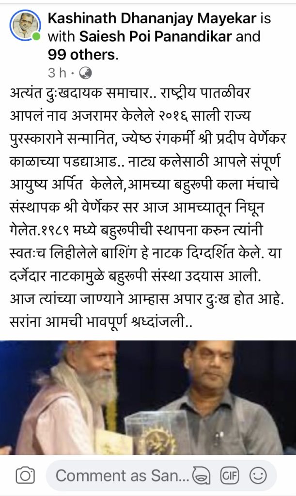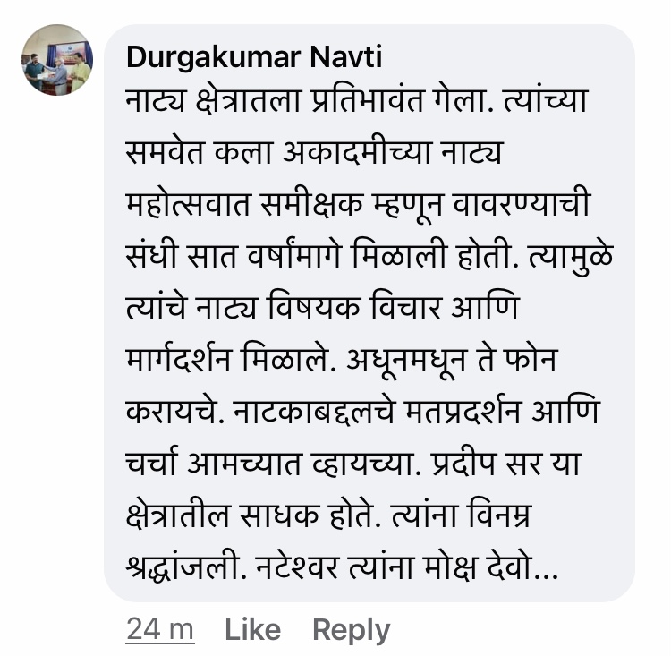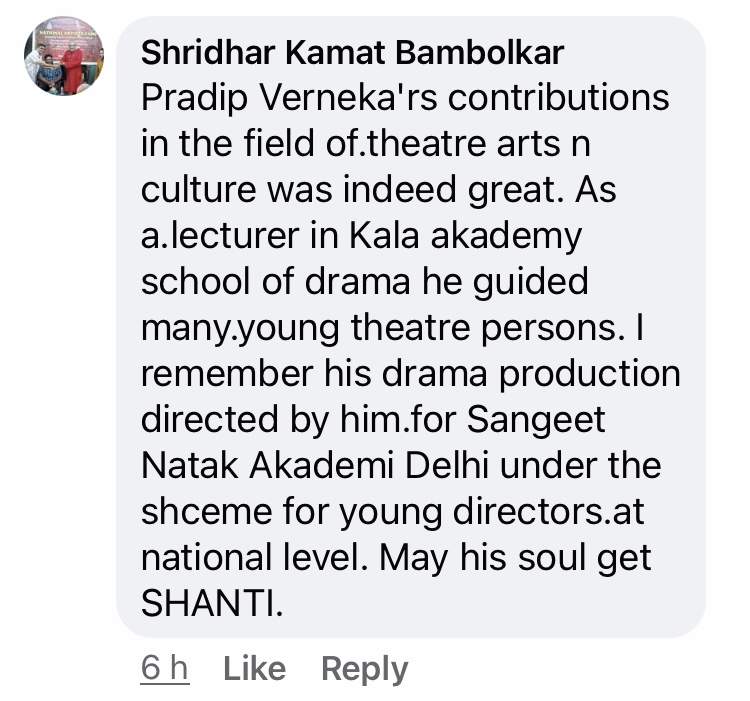 “Pradeep Vernekar was my senior at the NSD and later my colleague at Kala Academy Goa. I remember him as a soft-spoken person and he used to make extensive notes. His script, both Devanagari and Roman were well modulated. I heard from his classmates at NSD that he had given good performances in ‘Hedda Gabler’, ‘Himalay Ki Chhaya’ and ‘A View from the Bridge’. Just a few months ago, he lost his wife; Sushila Vernekar, also an alumnus of NSD. I pray for his soul to rest in peace and courage to his family members to bear this loss.“